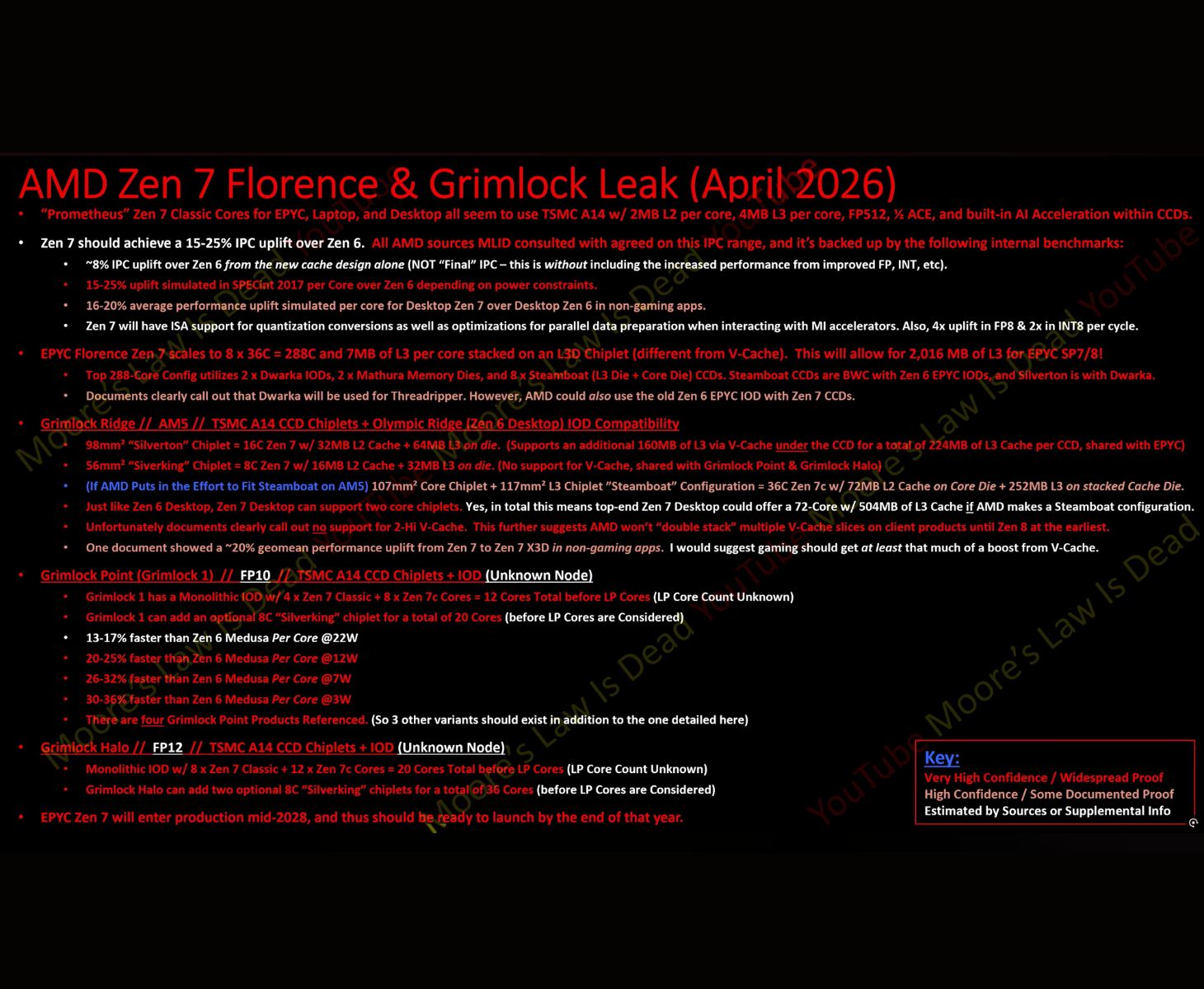 De acordo com um conjunto de slides compartilhados pelo conhecido vazador de hardware Tom, o apresentador da Lei de Moore está morta no YouTube, O carro-chefe da AMD, o Zen 7 EPYCda AMD, de codinome Florence, conta com duas matrizes de E/S "Dwarka" e duas matrizes de memória "Mathura", ambas com nomes de antigas cidades indianas de considerável importância histórica e espiritual, combinadas com até oito CCDs Steamboat de 36 núcleos, produzindo 288 núcleos por soquete.