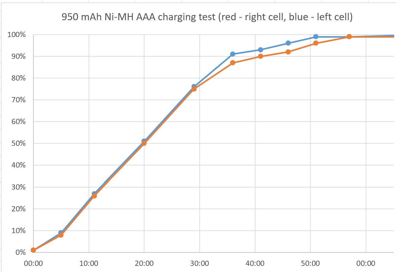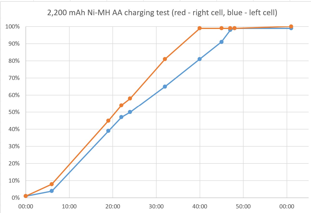 A taxa de carregamento dos pares AA foi visivelmente desigual, com uma célula carregando mais rápido do que a outra. Ao carregar pares, a máquina não ejetará a célula que terminou primeiro. As pilhas carregadas estavam levemente quentes ao toque.