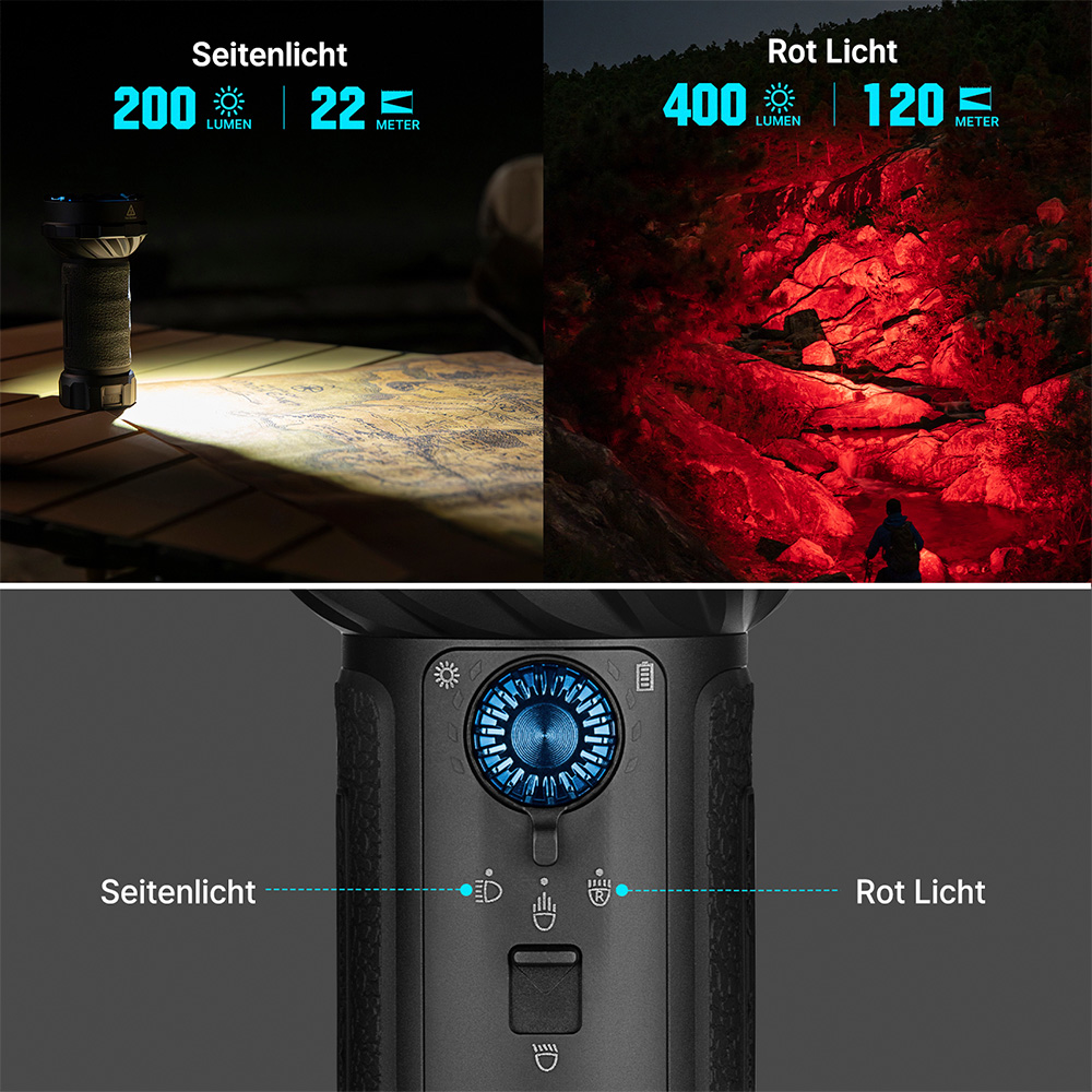 A lanterna tem vários controles, incluindo um botão giratório, uma chave seletora no botão que desliza para os lados e uma chave deslizante que controla o holofote, o holofote e o modo combinado. Este último não funciona quando a luz vermelha ou a luz lateral está acesa. O botão giratório também funciona como botão de energia.