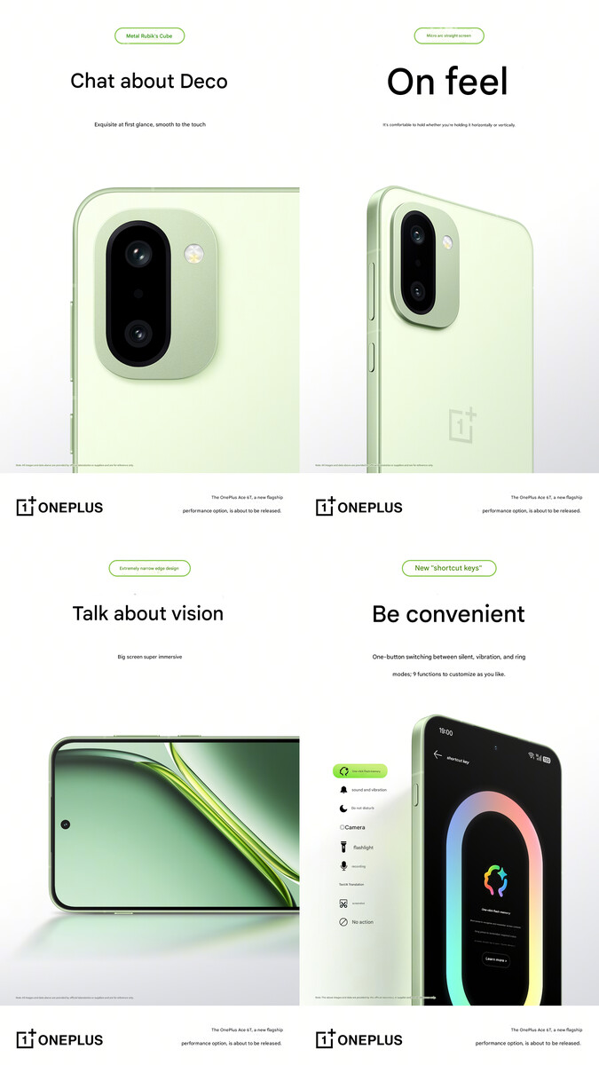 Além disso, as fotos confirmaram que o OnePlus Ace 6T virá com uma configuração de câmera dupla na parte traseira, com uma ilha de câmeras de aparência semelhante à do OnePlus 15. Embora a marca ainda não tenha confirmado, espera-se que esses dois deverão ser de sensores de 50 MP. A empresa, no entanto, confirmou que o telefone terá uma tela reta e uma construção leve.