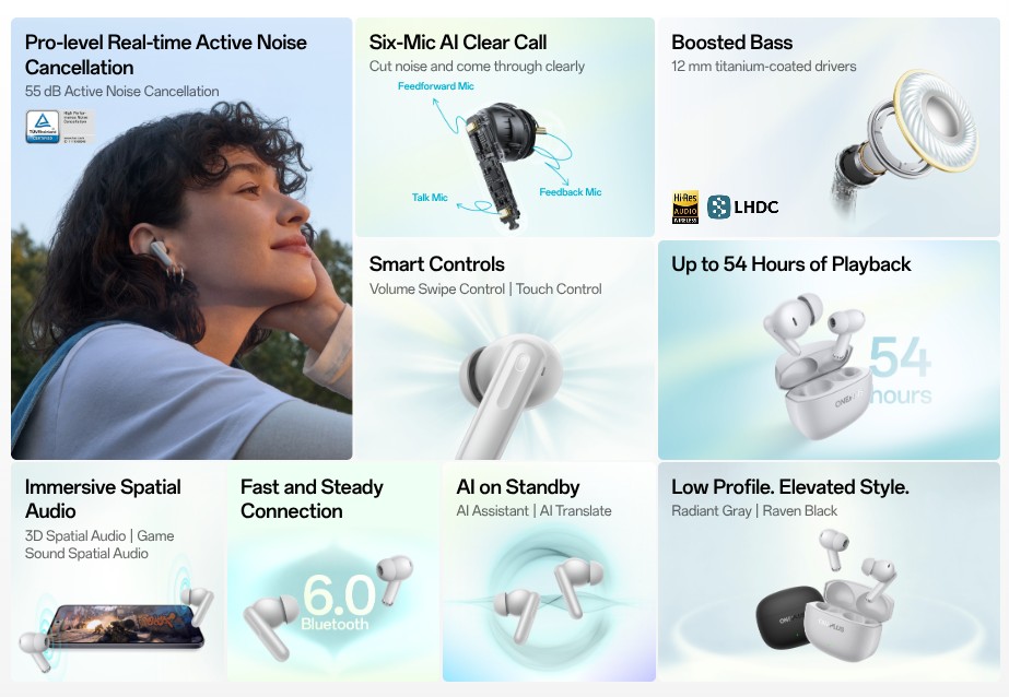 Cada fone de ouvido tem três microfones e eles funcionam com um algoritmo de IA exclusivo para detectar e reduzir o ruído do vento e do tráfego durante as chamadas. Outro novo recurso dos fones de ouvido é que eles são certificados para áudio de alta resolução e têm suporte para LHDC 5.0. Eles também têm áudio espacial 3D e áudio espacial Game Sound.