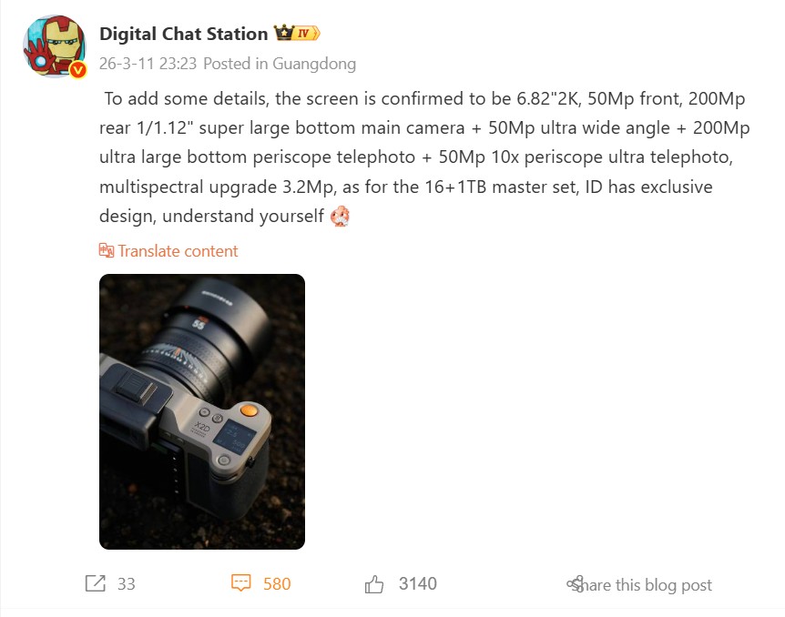 Os detalhes compartilhados pela Digital Chat Station sobre o Oppo Find X9 Ultra parecem mais confiáveis em comparação. Muitas das especificações mencionadas no post recente do Weibo do vazador já circularam do vazador já circularam antes, incluindo a câmera principal de 200 MP e 1/1,12 polegadas, que provavelmente usará o mesmo sensor Sony LYT-901 confirmado para o Vivo X300 Ultra. Juntamente com uma segunda lente teleobjetiva periscópica de 200 MP (3x), uma lente teleobjetiva periscópica de 50 MP (10x) e uma câmera ultralarga de 50 MP, o Find X9 Ultra terá um sensor multiespectral como seu antecessor (atualizado para 3,2 MP de acordo com o vazador), uma tela 2K de 6,82 polegadas e uma câmera frontal de 50 MP. Um novo detalhe notável é a sugestão de que a Oppo pode lançar uma Master Edition, que, segundo rumores, terá 16 GB de RAM, 1 TB de armazenamento e um design exclusivo. O design final permanece desconhecido, embora a Oppo possa se inspirar na câmera Hasselblad X2D, conforme mostrado na postagem do Weibo do vazador