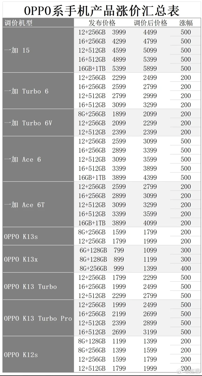 De acordo com uma tabela de ajuste de preços publicada no site Weiboo Oppo K13 Turbo e o K13 Turbo Pro tiveram um aumento de preço de 500 yuans (~$72,50). O preço do Oppo K13x aumentou em até 400 yuans (~ US$ 58), enquanto o K13s e o K12s tiveram aumentos de 200 yuans (~ US$ 29).