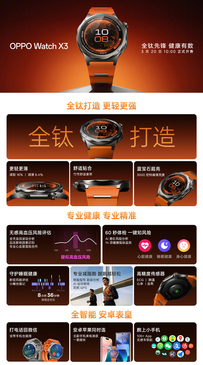 Enquanto isso, a bateria de 646 mAh incluída tem duração de até 5 dias no modo smartwatch. O Snapdragon W5 deve ajudar o Watch X3 a durar até 16 dias de bateria no modo de economia de energia. O Watch X3 também promete um conjunto de sensores de monitoramento de saúde, incluindo aqueles dedicados a fazer um ECG e verificar a temperatura da pele. A Oppo cobra CNY 2.799 (~$405) pelo Watch X3 em uma opção de acabamento em preto, laranja e titânio.