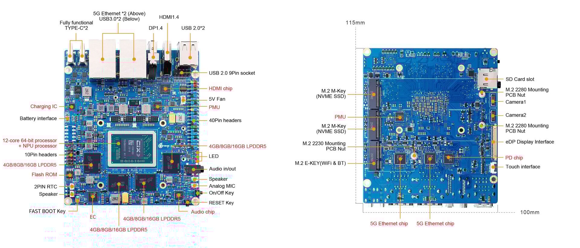 O Orange Pi 6 Plus é equipado com um SoC com doze núcleos e, dependendo da configuração, a memória LPDDR5 tem capacidade de 16, 32 ou 64 GB. Vários slots M.2 2280 para SSDs estão disponíveis, mas os usuários também podem instalar uma placa M.2 Key E para WiFi e Bluetooth. Como de costume, esse computador de placa única também tem um leitor de cartão SD.