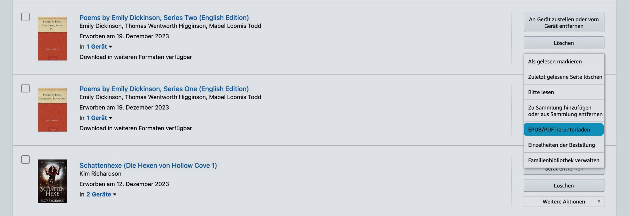 Para fazer o download de um eBook, selecione-o em "Digital Content" (Conteúdo digital) na sua conta da Amazon. Se uma versão sem DRM estiver disponível, a opção "Download EPUB/PDF" aparecerá em "More Actions" (Mais ações). Isso permite que o livro seja lido em eReaders sem o aplicativo Kindle. Vender sem DRM também significa que os livros podem, teoricamente, ser compartilhados com amigos, e é por isso que a Amazon está dando às editoras a opção de oferecer seus livros com ou sem DRM.