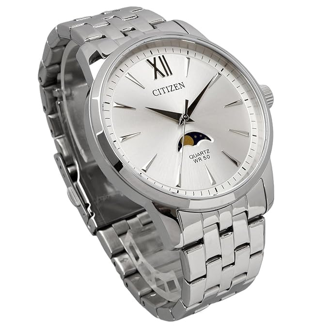 O modelo moonphase básico da Citizen é um relógio fino e elegante de três ponteiros (mostrador prateado) com complicações de calendário e lua. Normalmente, ele é vendido por volta de US$ 100-120. O estilo é simples e bastante elegante: uma caixa prateada e pulseira de aço combinando, com um mostrador tri-compax simétrico (dia, data, 24h/lua). Conforme relatado pelo Walmart, ele tem um movimento de quartzo e é resistente à água até 5 ATM (50 m), o suficiente para o uso diário. Esse Citizen é um relógio discreto - seu recurso mais notável é um submostrador que mostra a fase lunar -, o que o torna um relógio super sutil, porém funcional, para uso no escritório ou no vestuário.