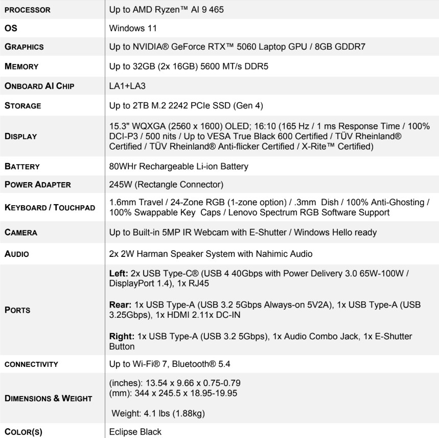 Especificações do Lenovo Legion 5a 15 Gen 11. (Fonte da imagem: Lenovo)
