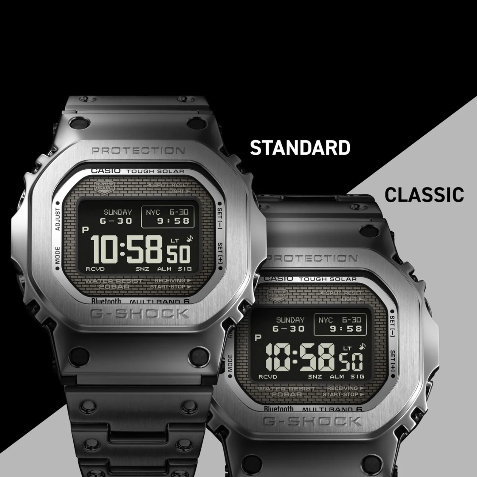 Tecnicamente, este é o primeiro relógio quadrado totalmente metálico a usar um LCD MIP (memory-in-pixel) de alto contraste, para um layout digital mais nítido e flexível do que os relógios quadrados G-SHOCK anteriores, incluindo várias configurações de exibição de hora e fontes alternáveis (padrão ou clássica de 7 segmentos) por meio do aplicativo complementar. Sob o capô, os compradores receberão a folha de especificações padrão do relógio-ferramenta G-Shock: resistência à água de 20 bar, carregamento Tough Solar, construção resistente a choques, Bluetooth Smartphone Link, controle de rádio Multiband 6, hora mundial, cronômetro, timer de contagem regressiva, cinco alarmes e luz de fundo de LED totalmente automática.