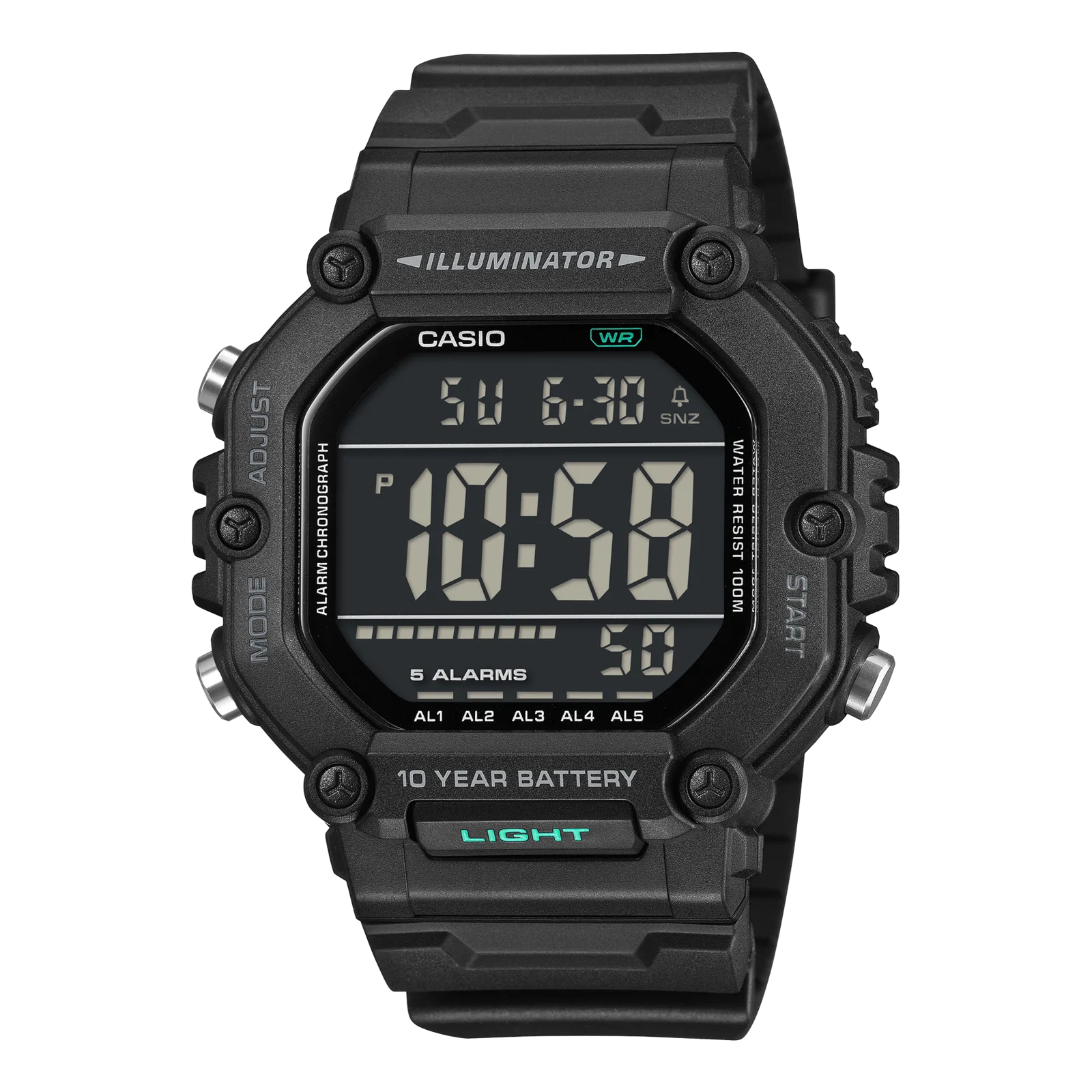 O maior ponto de venda da série AE-1600HX provavelmente será a alegada duração de 10 anos da bateria, graças a uma pilha CR2032. Ele também possui resistência à água de 100 metros, o que já o aproxima dos relógios esportivos de nível básico típicos da Casio. Além disso, o AE-1600HX-1BV apresenta um visor negativo - o design totalmente preto costuma ser mais popular entre os compradores.