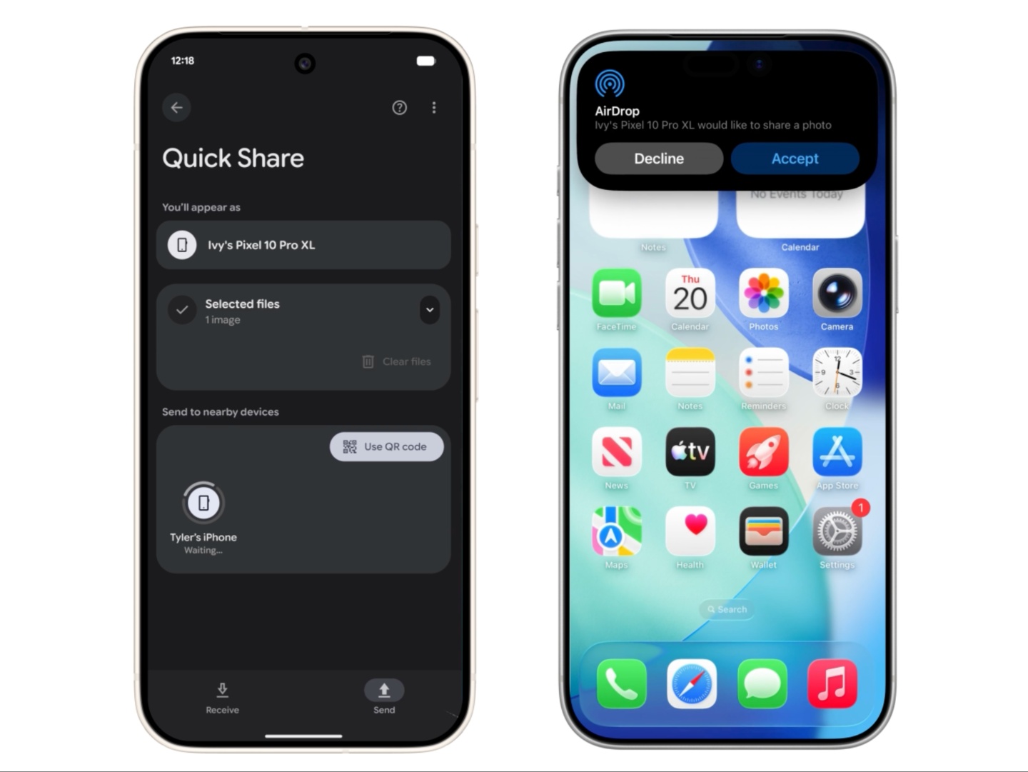 Conforme mostrado na animação, o menu Quick Share poderá encontrar iPhones que tenham o AirDrop ativado quando estiverem próximos, com a visibilidade definida como "Todos por 10 minutos", e então enviar arquivos facilmente. Da mesma forma, os proprietários de iPhone ou qualquer dispositivo Apple com AirDrop podem usar o menu AirDrop para compartilhar arquivos com dispositivos Pixel 10 nas proximidades. O Google diz que o recurso está começando a ser implementado para a série Pixel 10 hoje (20 de novembro) e a empresa está trabalhando para expandir para outros dispositivos Android.