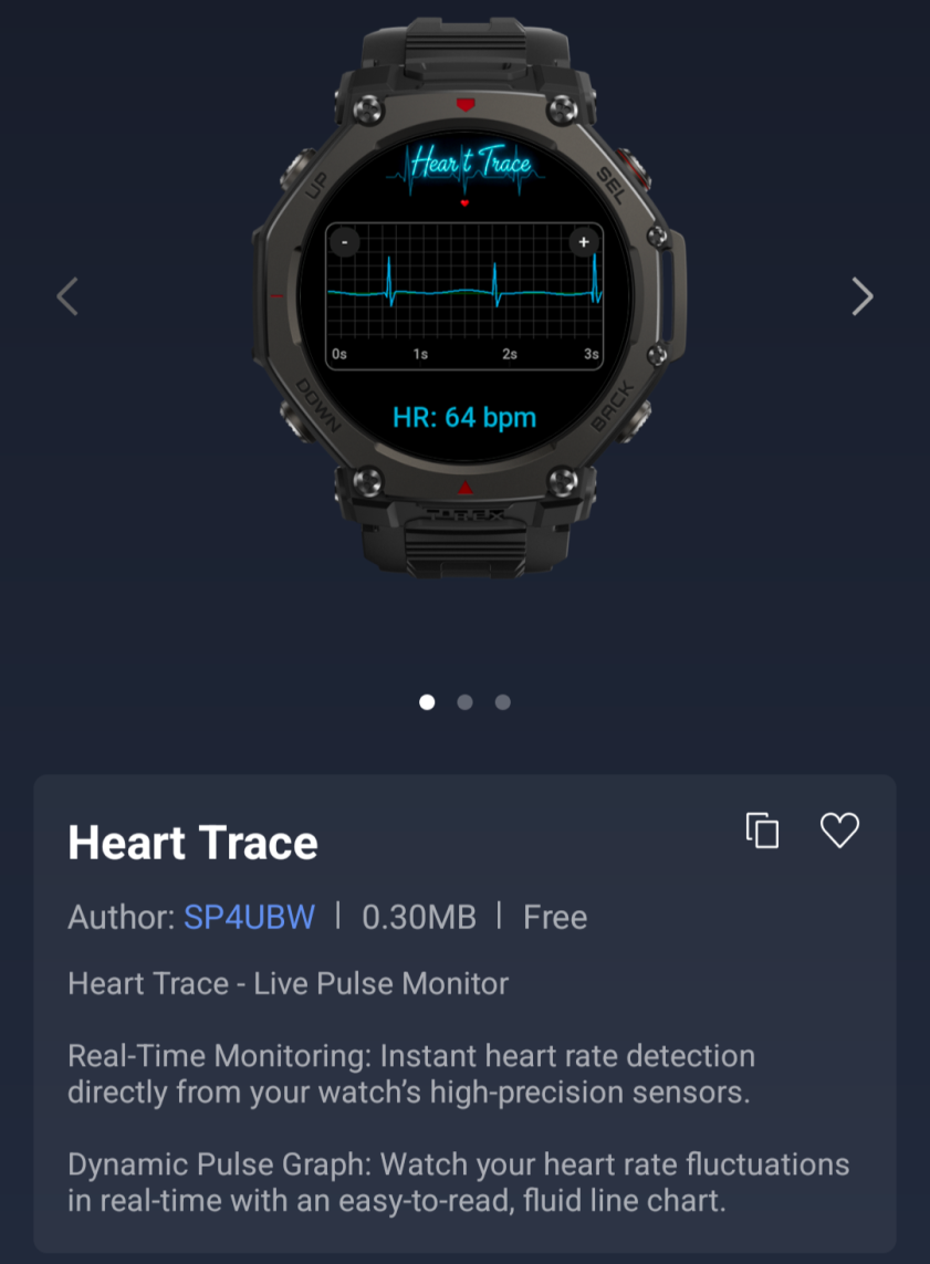 O mais popular dos três Mini Apps é o Heart Trace, atualmente na segunda posição do Zepp OS Weekly Top 50 Downloaded Apps Chart. Trata-se de um monitor de pulso ao vivo, que permite aos usuários visualizar os dados de frequência cardíaca coletados pelo smartwatch em tempo real. As medições são exibidas em um gráfico de pulso dinâmico, descrito pelo desenvolvedor como "um gráfico de linhas fluido e fácil de ler".