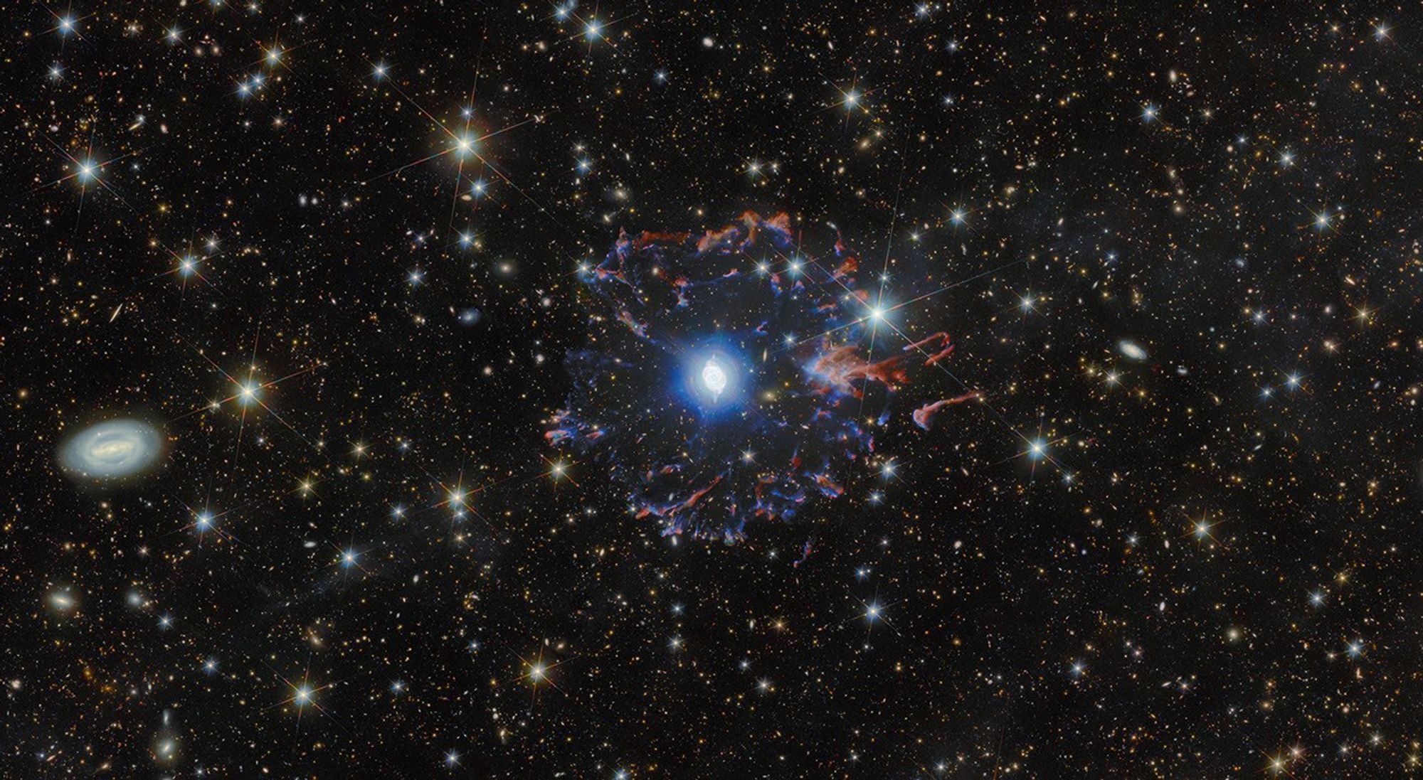 Recentemente, porém, os telescópios Hubble e Euclid obtiveram novas imagens dessa estrutura, destacando a complexidade dessa nebulosa e oferecendo um espetáculo incrível. De fato, na primeira imagem, tirada pelo Euclid, é possível ver um halo colorido de gás que parece estar se afastando da estrela.