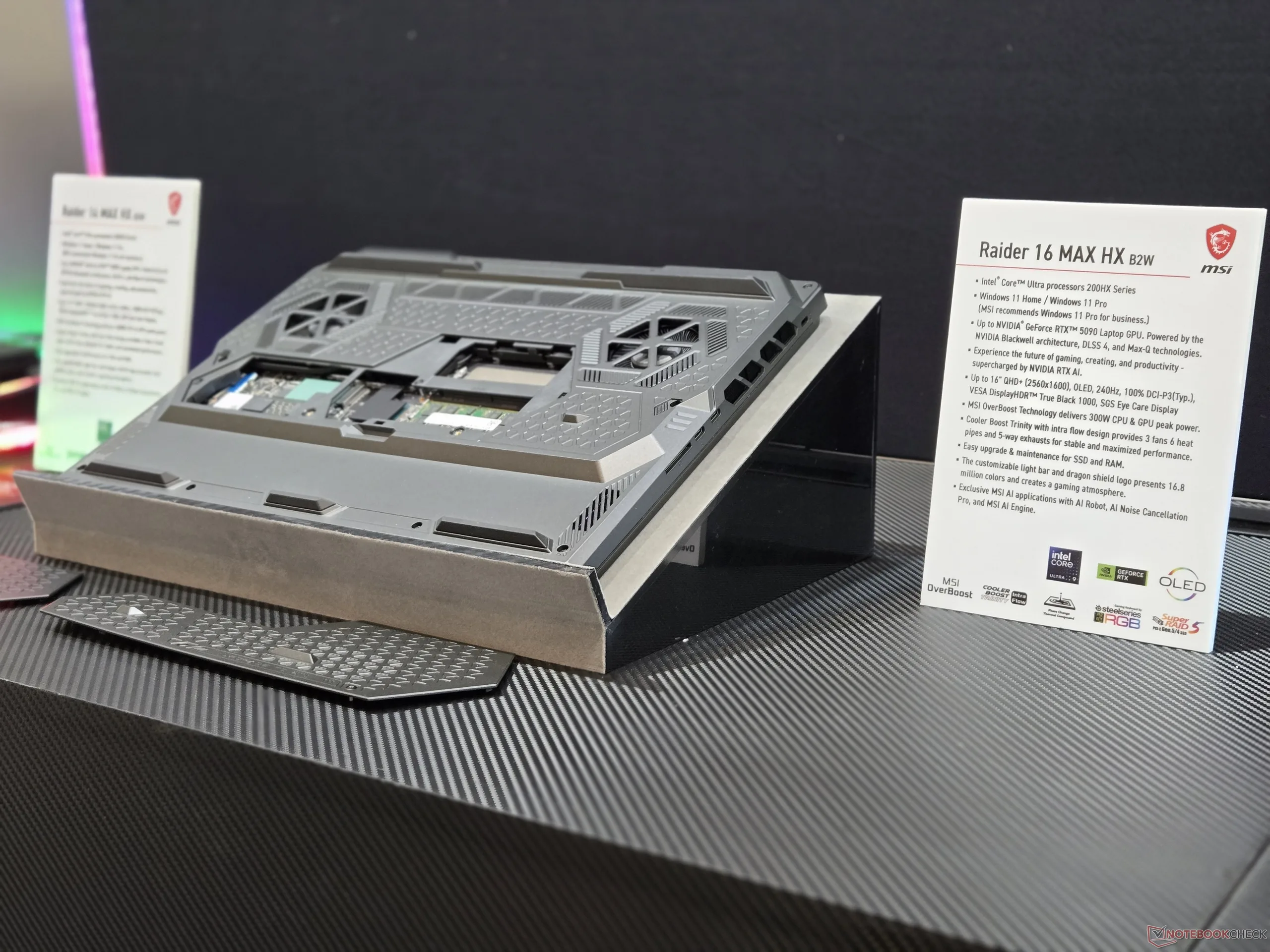 Revelado há apenas algumas semanas na CES 2026o novo Raider 16 HX Max será executado com as CPUs Intel Arrow Lake-HX e o hardware Nvidia Blackwell conhecidos como o modelo 2025. No entanto, o chassi foi redesenhado este ano com uma nova escotilha no painel inferior para facilitar o acesso aos componentes atualizáveis, conforme mostrado nas imagens abaixo. Nesse caso, os proprietários poderão instalar até dois módulos DDR5 SODIMM e dois SSDs M.2 PCIe5 sem a necessidade de abrir todo o painel inferior.