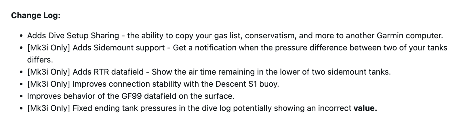 Os smartwatches Garmin Descent Mk3 e Mk3i ganham um novo recurso de compartilhamento de configuração de mergulho com a versão 25.21. Isso permite que os usuários copiem informações como sua lista de gás e conservadorismo para outro dispositivo Garmin. Ambos os aparelhos também estão vendo uma melhoria nos dados do Fator de Gradiente 99% (GF99) mostrados quando na superfície.