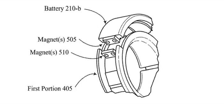 Como mostram as ilustrações, a bateria está localizada em uma metade do anel. A parte externa, na qual a bateria está localizada, pode ser facilmente removida e substituída, se necessário. Tanto o módulo da bateria quanto o anel contêm pequenos ímãs que mantêm a bateria no lugar. Os contatos metálicos permitem que a corrente seja transmitida da bateria para o anel, de modo que os usuários não precisem mexer em pequenos plugues para substituir a bateria.