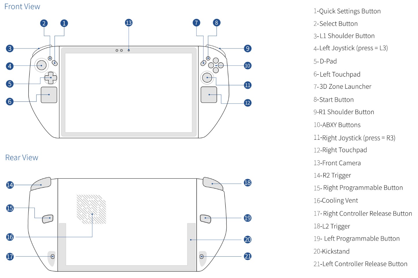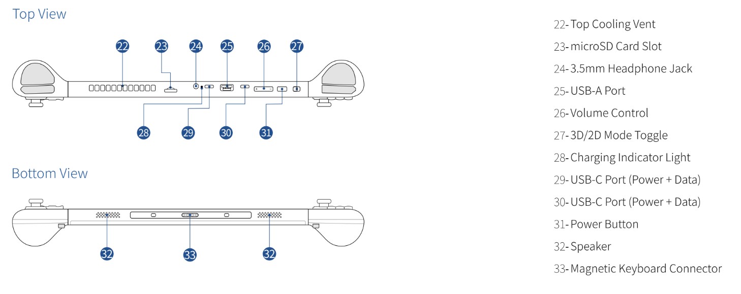 Ele pesa 0,87 kg (1,92 lbs.), o que é semelhante ao Surface Pro 10, que pesa 0,885 kg (1,95 lbs.). Os controles de jogos de tamanho normal com joysticks de efeito Hall acrescentam mais 0,24 kg (0,53 lbs.) quando conectados. Assim como o Surface Pro, um teclado e um suporte opcionais podem ser adquiridos, permitindo que o 3D One seja usado como um laptop 2 em 1.