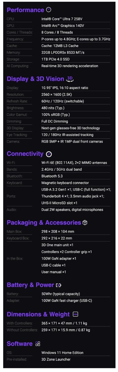 O 3D One utiliza o método de barreira de paralaxe para produzir imagens 3D reais sem óculos em sua tela LCD sensível ao toque de 10,95 polegadas, 2.560 x 1.600, 120 Hz, que oferece um brilho máximo de 480 nits. Quando o botão do modo 3D é ativado, o 3D One utiliza uma câmera de rastreamento ocular AI de 180 Hz para renderizar adequadamente o efeito 3D em sua tela estereoscópica.