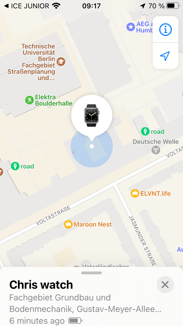 Ao voltar para casa, o iPhone atualizou corretamente a localização, indo de nossa casa para a sala de escalada. Entretanto, se seu filho estiver em algum lugar sem dispositivos Apple próximos, o rastreamento não funcionará. É nesse ponto que os relógios com GPS ou SIM têm claramente uma vantagem.