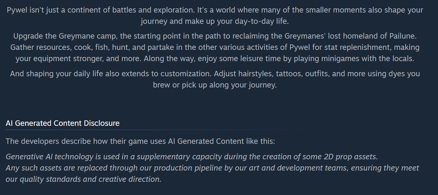 A página do Steam Crimson Desert agora exibe um aviso de isenção de responsabilidade, conforme exigido pela Valve. O texto diz: "A tecnologia de IA generativa é usada em uma capacidade suplementar durante a criação de alguns recursos de adereços 2D" Assim como na postagem da mídia social, a Pearl Abyss explica que essas imagens de espaço reservado devem ser apenas temporárias.