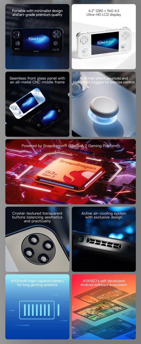 Além disso, a Ayaneo equipa o Pocket S Mini com uma tela de 4,2 polegadas com resolução nativa de 1.280 x 960 pixels e proporção de 4:3. No entanto, não há informações sobre os valores máximos de brilho. Independentemente disso, o Pocket S Mini também conta com RAM LPDDR5X com clock de 8.533 MT/s e armazenamento flash UFS 4.0 ou UFS 3.1 com SKUs de 128 GB.