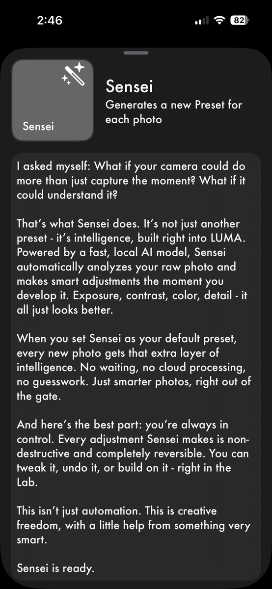 Isso, combinado com o novo pipeline de processamento de imagens, permite o recurso exclusivo da câmera da Luma: o botão "Test". As fotos brutas são notoriamente difíceis de capturar quando se trata de lidar com a exposição e, portanto, agora basta manter pressionado esse botão para obter uma visualização rápida e compatível com EDR diretamente no visor... Com relação ao compartilhamento de predefinições - tecnicamente, elas já podem ser compartilhadas por meio de transferência de arquivos, pois podem ser acessadas no aplicativo Files. Tenho uma meta aproximada de hospedar um mercado de predefinições leve para que os usuários publiquem seus estilos, mas acredito que ainda é um pouco cedo para isso. Na verdade, esse era um recurso do Luma 2, mas definitivamente era muito cedo.