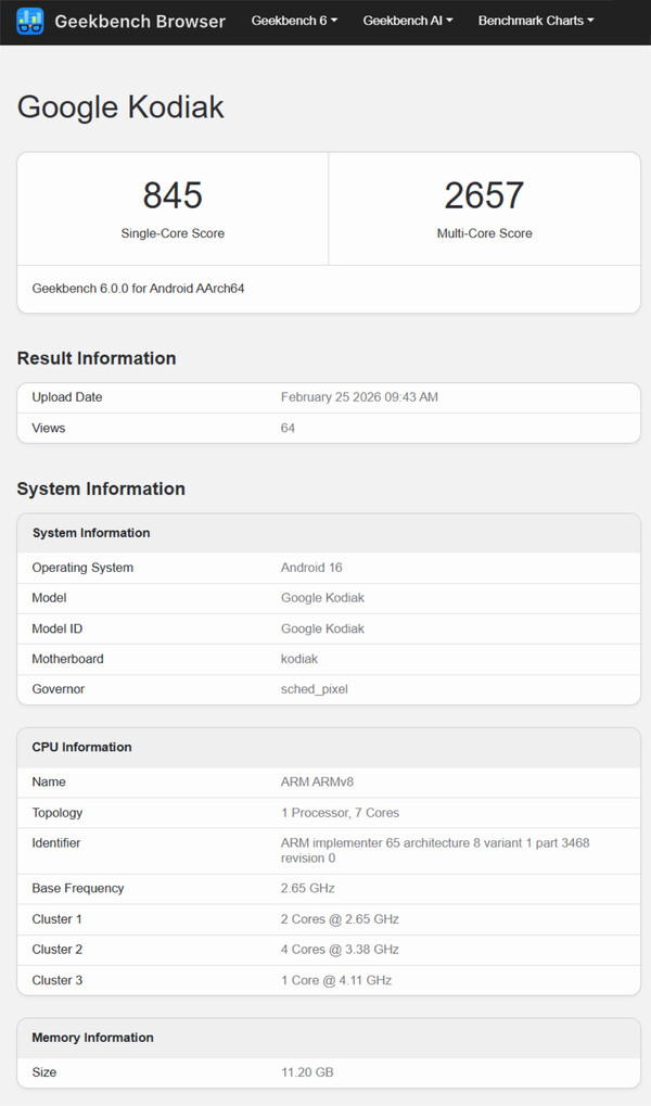 Agora, uma listagem vazada do Geekbench sugere que o Google está planejando uma saída incomum para a próxima série Pixel 11. Como sempre, a plataforma de benchmarking não fornece um nome de varejo. No entanto, o "Google Kodiak" já foi já foi estabelecido como o codinome do Pixel 10 Pro XL.