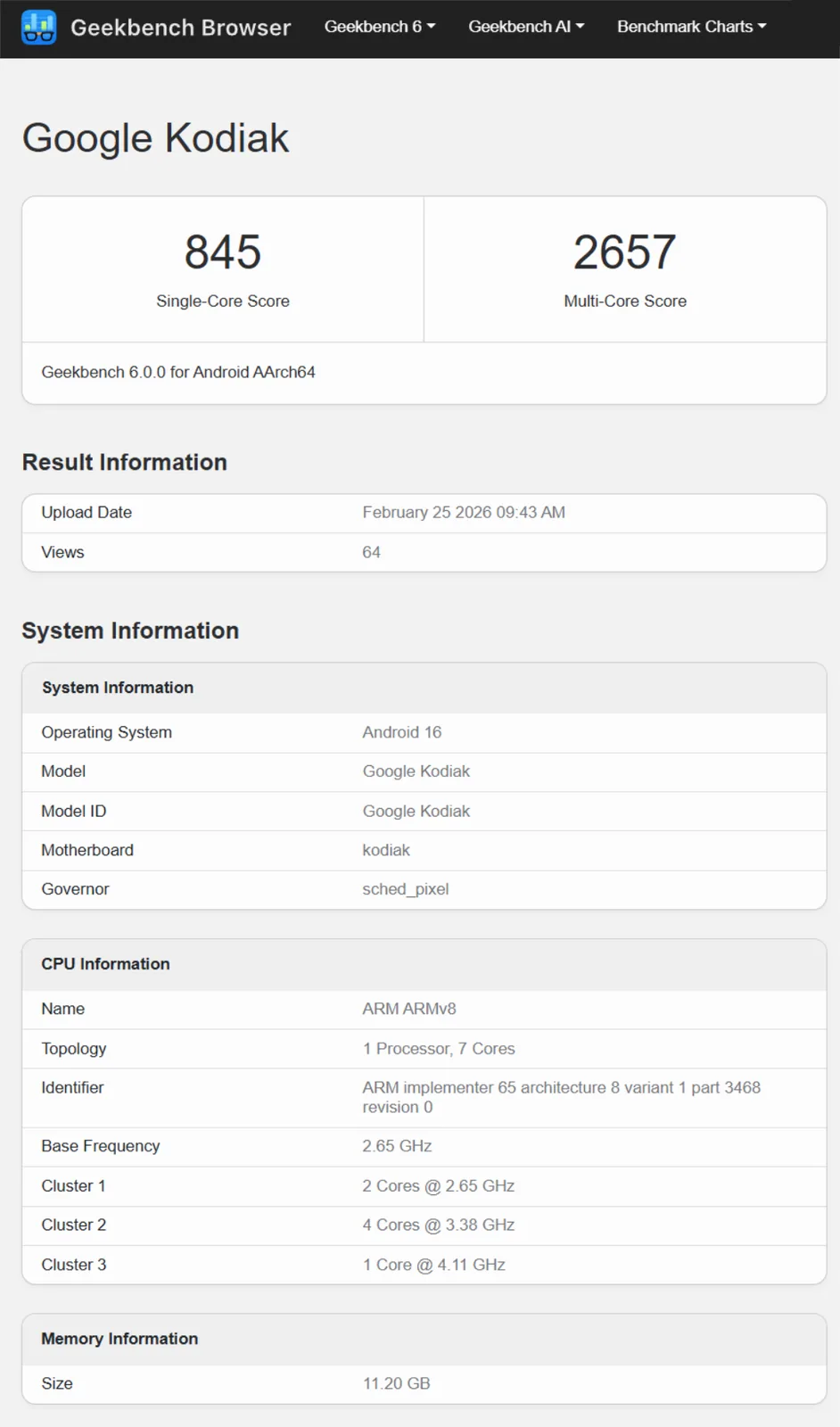 Especificamente, a listagem de benchmark menciona um núcleo principal com clock de 4,11 GHz, com quatro núcleos no cluster 2 atingindo 3,38 GHz e dois núcleos no cluster 3 atingindo 2,65 GHz. Além disso, a listagem menciona 12 GB de RAM e uma iGPU PowerVR série C CXTP-48-1536 para substituir a DXT-48-1536 dentro do Tensor G5. Até o momento, não há garantia de que essa listagem seja genuína. A série Pixel 11 não é esperada até o verão, nem o chipset Tensor G6.