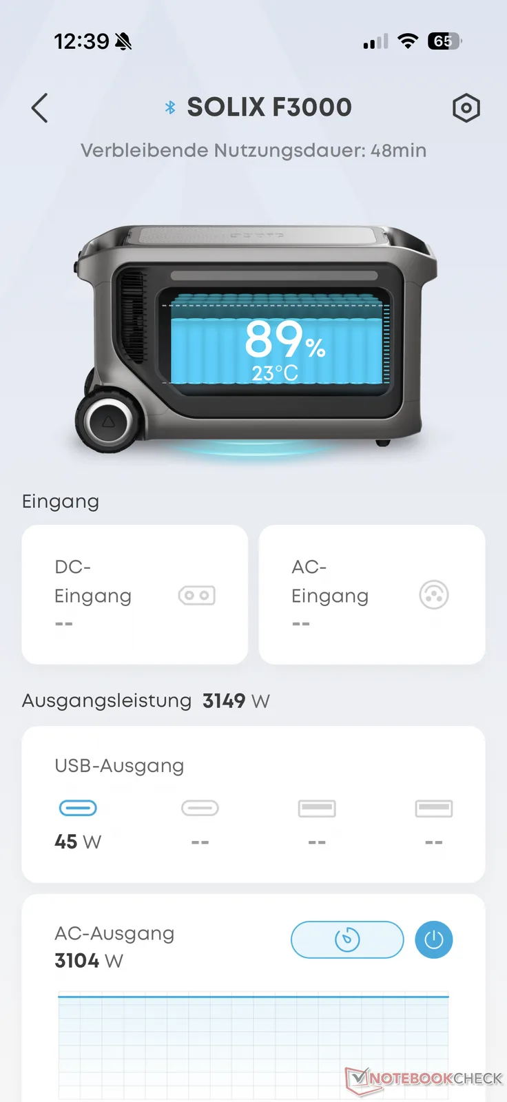 Um aspecto positivo do teste do Anker Solix F3000 foi sua operação silenciosa. Mesmo com uma boa saída de CA de 3.000 W, a estação de energia funciona de forma muito silenciosa. Ocasionalmente, ela só fazia um pouco de barulho, mas permanecia agradavelmente em segundo plano, com cerca de 35 dB (medido a uma distância de 1 m). Além disso, a função UPS para fonte de alimentação ininterrupta interveio rapidamente quando necessário.
