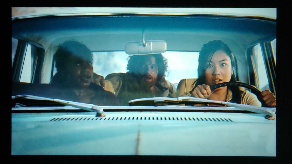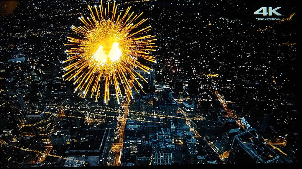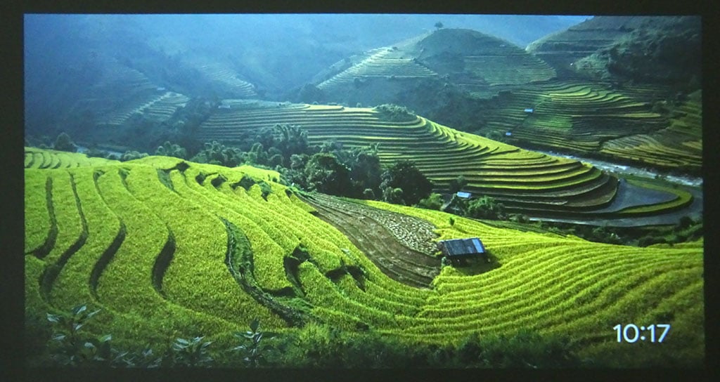 Os 230 lúmens ISO de brilho do projetor com uma tela de 65 polegadas produzem uma imagem satisfatória no modo de imagem padrão, com desempenho sólido em cenas muito claras e muito escuras. A nitidez é boa e os detalhes, como a barba de um homem, não ficam muito nítidos. A uniformidade da luz de fundo de LED é muito boa e a pequena queda nos cantos não é visível durante o uso normal.