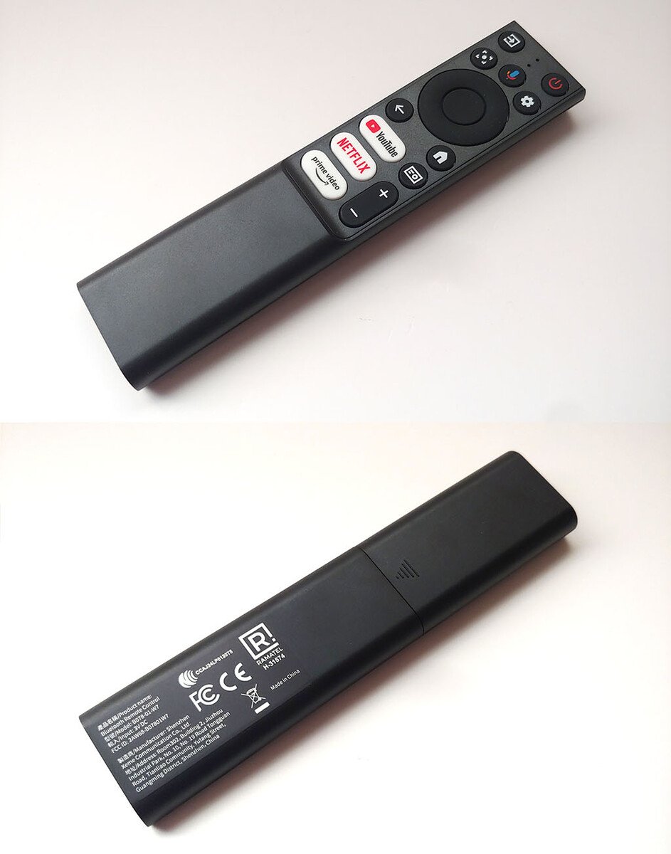Os botões de energia, home e configurações estão localizados na linha superior, seguidos por quatro botões de seta em torno de um botão central OK, depois uma linha de botões para voltar, informações e modo de entrada, seguidos por duas linhas de botões dedicados a iniciar o Netflix, YouTube e Amazon Prime Video e iniciar a configuração automática de imagem. Os botões de volume e mudo estão localizados na linha inferior, em um nível elevado, o que facilita a localização pelo tato no escuro.