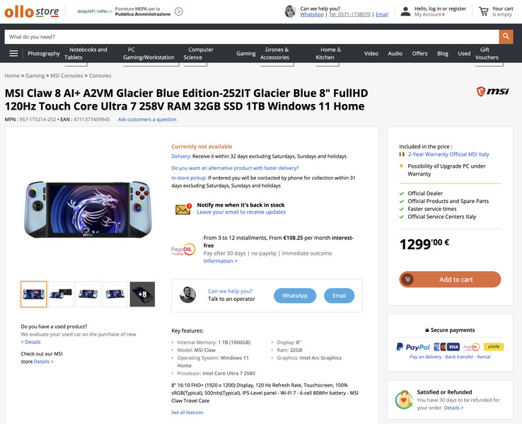 Aparentemente, nenhuma dessas mudanças foi concretizada em unidades de varejo. Por enquanto, a MSI permanece em silêncio sobre a disponibilidade e o preço. No entanto, a Ollo Store parece ter respondido a esta última pergunta com uma listagem de varejo antecipada https://www.ollo.it/msi-claw-8-ai-a2vm-glacier-blue-edition-252it-glacier-blue-8-fullhd-120hz-touch-core-ultra-7-258v-ram-32gb-ssd-1tb-windows-11-home/p_956815.