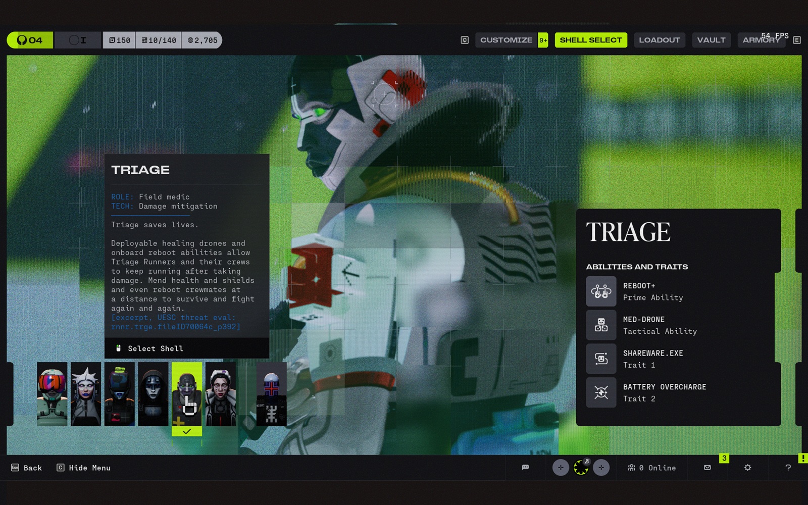Um dos primeiros sinais mais fortes é o fato de Marathon tratar seus escudos como arquétipos reais de jogabilidade em vez de invólucros cosméticos. A lista de cascas inclui Thief (Ladrão), Destroyer (Destruidor), Vandal (Vândalo), Assassin (Assassino), Recon (Reconhecimento) e Triage (Triagem), sendo que cada casaca é construída com base em suas próprias habilidades e características. Na prática, isso dá ao jogo uma estrutura de classe imediata centrada em furtividade, interrupção, suporte, reconhecimento, mobilidade e agressão direta.