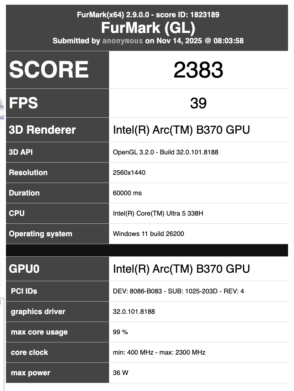 Para isso, a listagem do FurMark reproduzida abaixo confirma que o benchmark foi executado em um dispositivo com Core Ultra 5 338H com a mesma resolução de todos os lançamentos anteriores do OneXPlayer X1. Portanto, parece provável que esse parâmetro de comparação esteja relacionado ao mesmo dispositivo portátil Panther Lake encontrado recentemente no Geekbench.