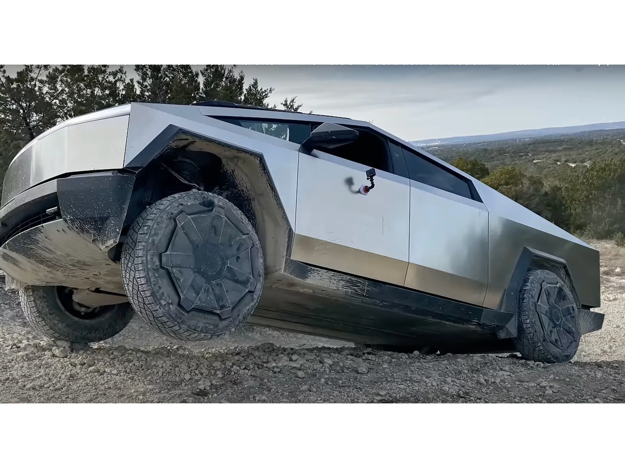 Por volta da marca de 4:27, o Cybertruck precisa passar por uma colina pequena, mas íngreme e, ao contrário dos outros dois veículos, não consegue, apesar de várias tentativas. Somente depois de muitas outras tentativas e de abas de plástico quebradas é que a picape eletrônica finalmente consegue subir a colina.