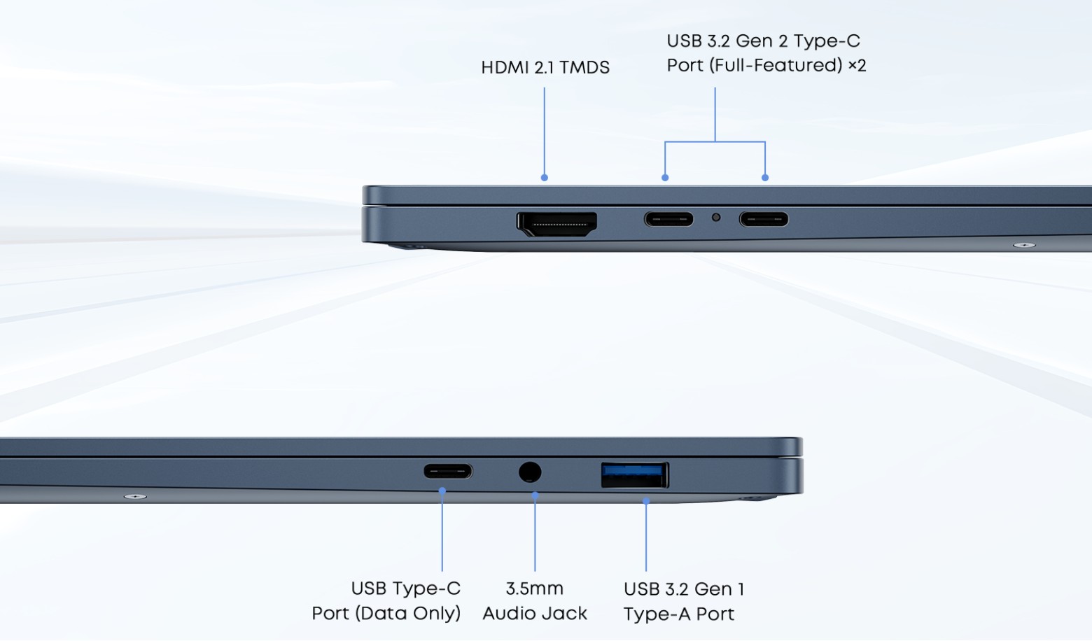 A Chuwi está posicionando o CoreBook Air como um notebook de trabalho compacto para usuários preocupados com o preço. O dispositivo de 14 polegadas é alimentado por um AMD Ryzen 5 6600H, que oferece reservas de desempenho suficientes para tarefas típicas de escritório e multitarefa. Outros recursos incluem 16 GB de RAM e um SSD rápido, que mantém o sistema agradavelmente responsivo no uso diário. A tela IPS fosca garante uma exibição decente em diferentes condições de iluminação. O Windows 11 é usado como sistema operacional, o que significa que o notebook está pronto para uso imediato.