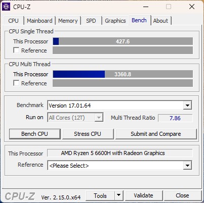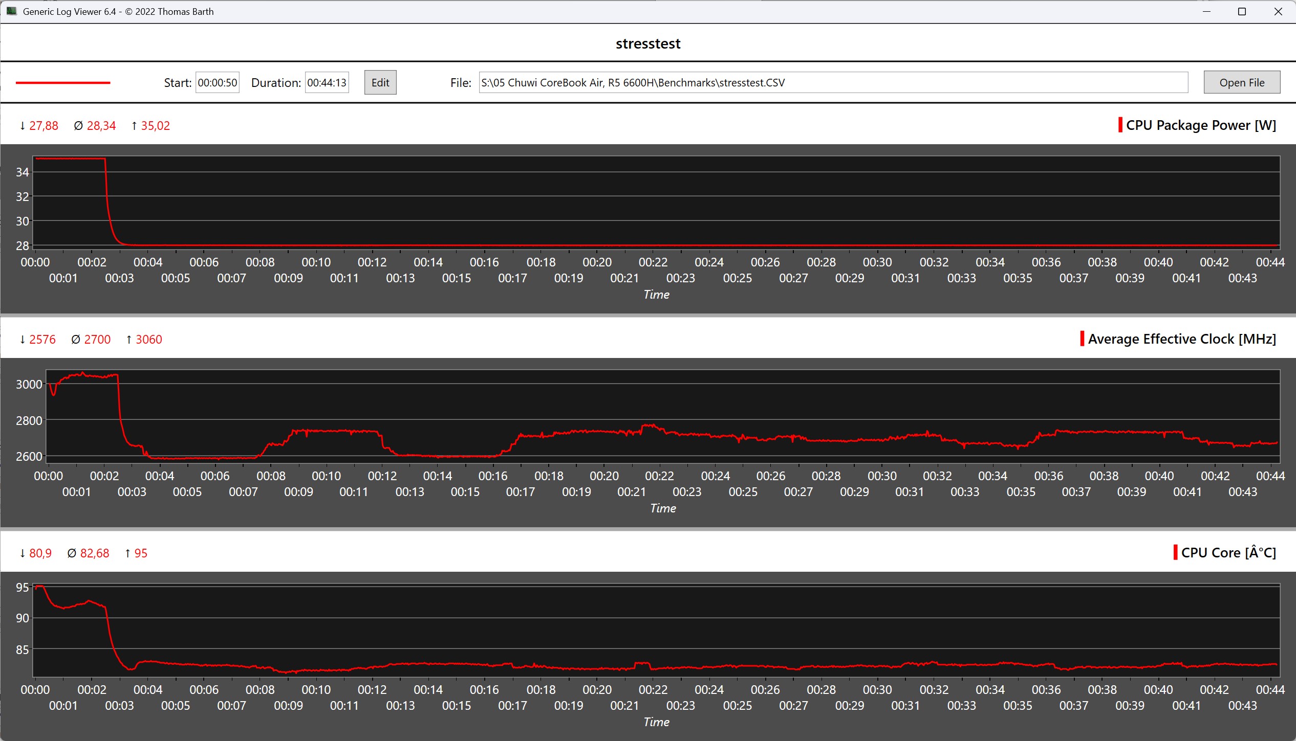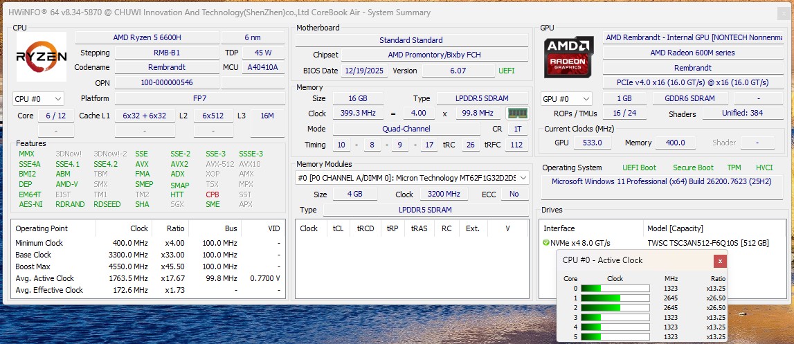 O Chuwi CoreBook Air é equipado com um AMD Ryzen 5 6600H, um processador de 6 núcleos com 12 threads, projetado para uma combinação equilibrada de eficiência e desempenho. Isso proporciona potência de computação mais do que suficiente para tarefas clássicas de escritório, aplicativos da Web, consumo de mídia e trabalho paralelo com vários programas. Em comparação, nossa amostra de teste está em pé de igualdade com o AMD Ryzen 5 7535HS usado no Ninkear S14. Em uma inspeção mais detalhada, percebe-se que o AMD Ryzen 5 6600H no CoreBook Air está permanentemente limitado a cerca de 28 watts. Como resultado, o desempenho disponível está abaixo do que a CPU poderia alcançar basicamente. Em comparação com nossos valores médios com um processador idêntico, o notebook fica atrás em termos de desempenho em cerca de dez por cento.