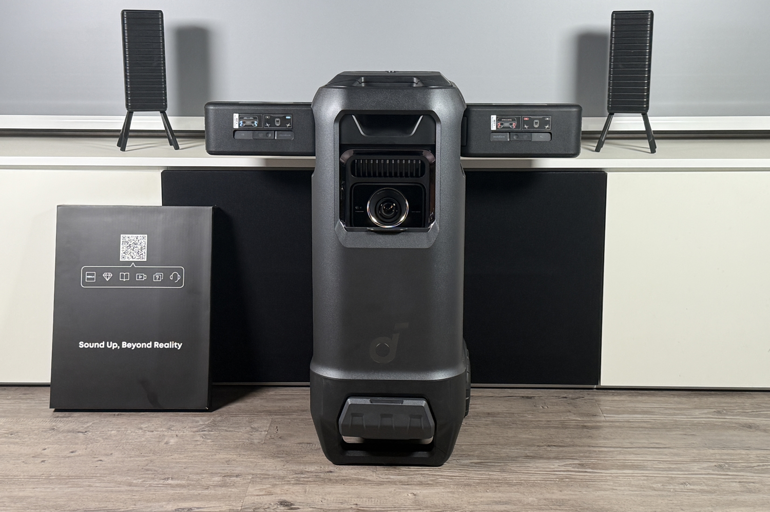 A Anker Soundcore resolveu esses "problemas" com o novo X1 Pro e incluiu um sistema de som espacial 7.1.4 com Dolby Atmos no projetor XXL. Isso significa que há um total de 7 canais horizontais, subwoofers e quatro alto-falantes para efeitos de altura acima da cabeça.