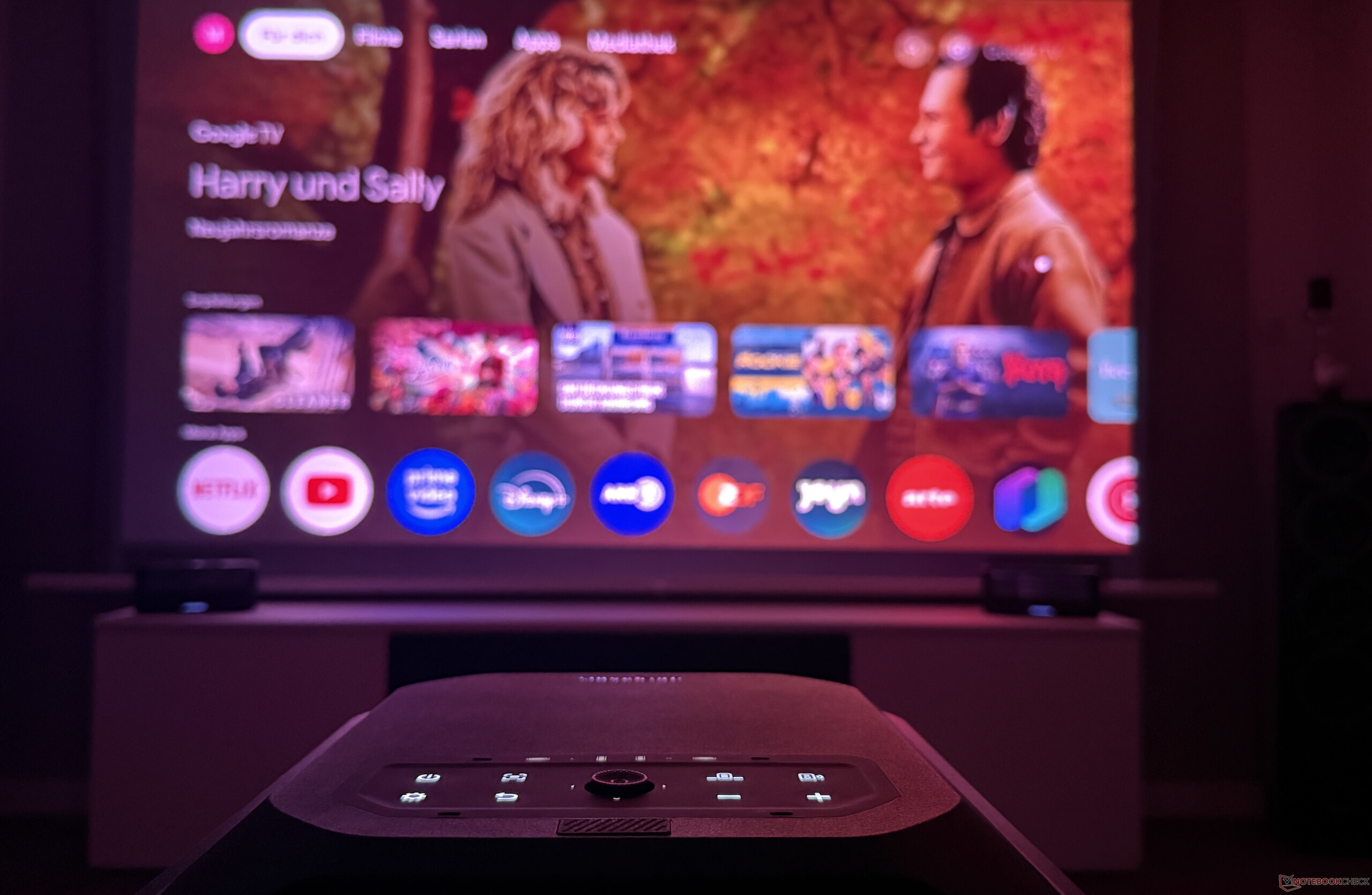 Assim como no modelo pequeno, o mesmo se aplica ao X1 Pro grande: o projetor a laser oferece uma imagem atraente em salas escuras. O resultado também é perfeitamente aceitável em ambientes internos à luz do dia, por exemplo, para assistir futebol em uma tarde de sábado.
