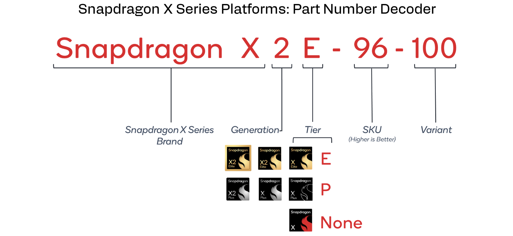 Considerando o número de processadores disponíveis (veja a tabela abaixo), essa nomenclatura pode se tornar confusa rapidamente e não é ideal para os clientes. Além dos modelos X2 Elite e X2 Elite Extreme, a Qualcomm também lança dois modelos X2 Plus para dispositivos de baixo custo. Como sempre, o desempenho dos chips também varia entre os diferentes dispositivos devido aos diferentes limites de energia. Além disso, os clocks da GPU mais uma vez variam de acordo com o modelo da CPU, portanto, mesmo que as duas GPUs tenham o mesmo nome (como Adreno X2-90), os clocks e, portanto, o desempenho podem variar sensivelmente.