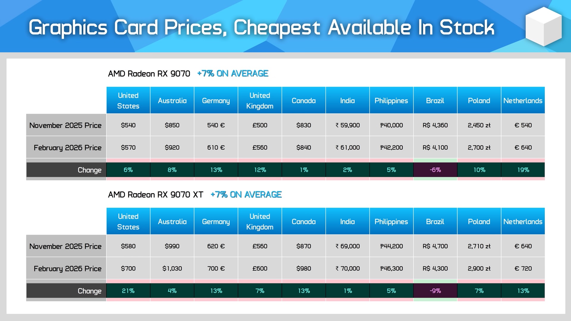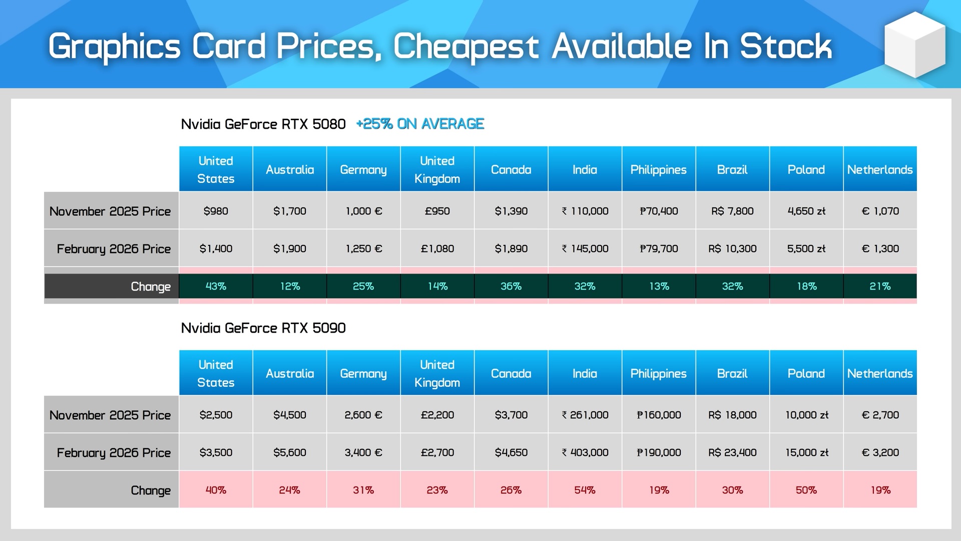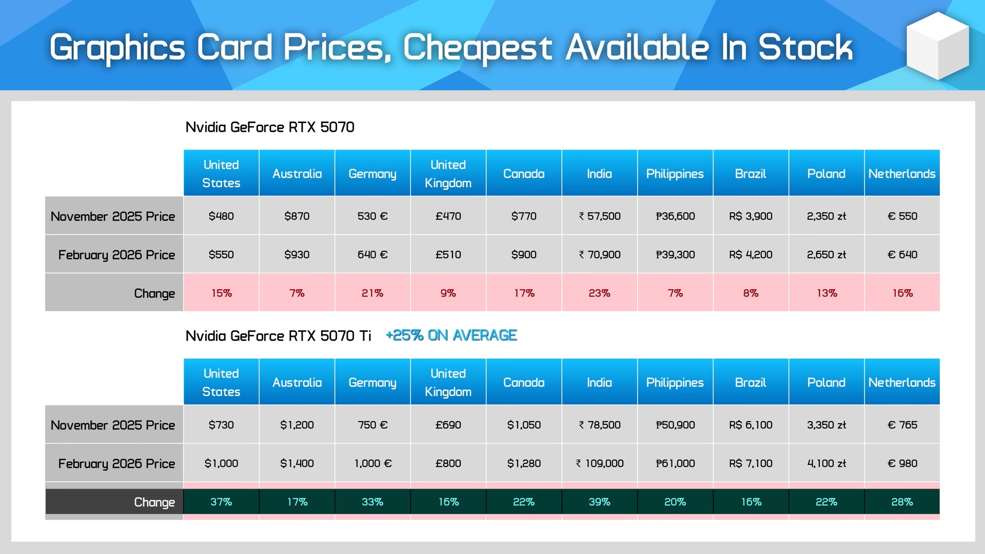 A RTX 5070 Ti, que se suspeita ter sido severamente limitada em termos de fornecimento, custa atualmente uma média de 25% a mais em fevereiro de 2026 do que em novembro de 2025 nas 10 regiões analisadas pela HU. Esses números são de 25% e 32% para a RTX 5080 e a RTX 5090, respectivamente. O interessante aqui é que a RX 9070 XT, que compete diretamente com a RTX 5070 Ti, registrou apenas um aumento médio de preço de 7% desde novembro de 2025 em todo o mundo.
