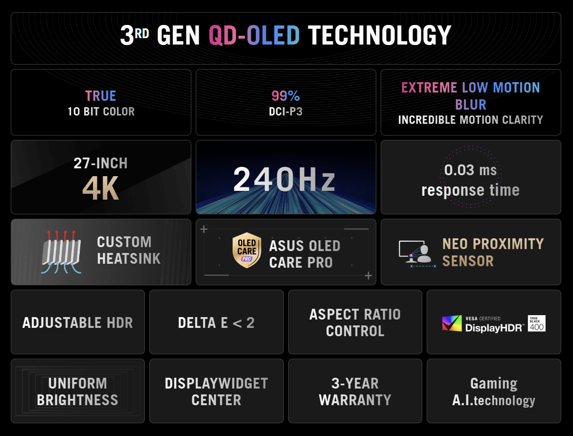Outro monitor QD-OLED de 3ª geração, o ROG Strix OLED XG27UQDMS serve como uma alternativa menor ao ROG Strix OLED XG32UQDMSque também chegou ao Reino Unido. O monitor de 27 polegadas não apenas produz 4K e 240 Hz, mas também oferece brilho de pico de 1.000 nits no modo HDR (APL 3%) e tempos de resposta GtG de 0,03 ms, ao mesmo tempo em que atenua o rasgo da imagem por meio das tecnologias AMD FreeSync Premium e Nvidia G-Sync. Além disso, a Asus inclui as seguintes portas: