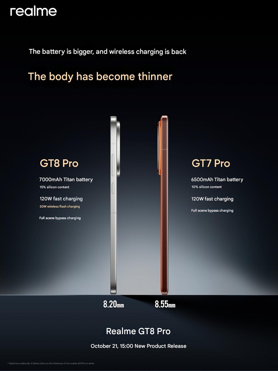 Assim como a Oppo, a Realme oferece uma opção 4K120 para gravações em câmera lenta de altíssima resolução, mesmo em Dolby Vision e 10-bit Log. Além da câmera, o Realme GT 8 Pro oferece várias melhorias, como a duração da bateria. Apesar de um chassi mais fino em comparação com o Realme GT 7 Pro, a bateria de 7.000mAh é 500mAh maior e ainda cabe no chassi com certificação IP69. O telefone também conta com carregamento rápido de 120 W e agora também pode ser carregado sem fio com até 50 W.