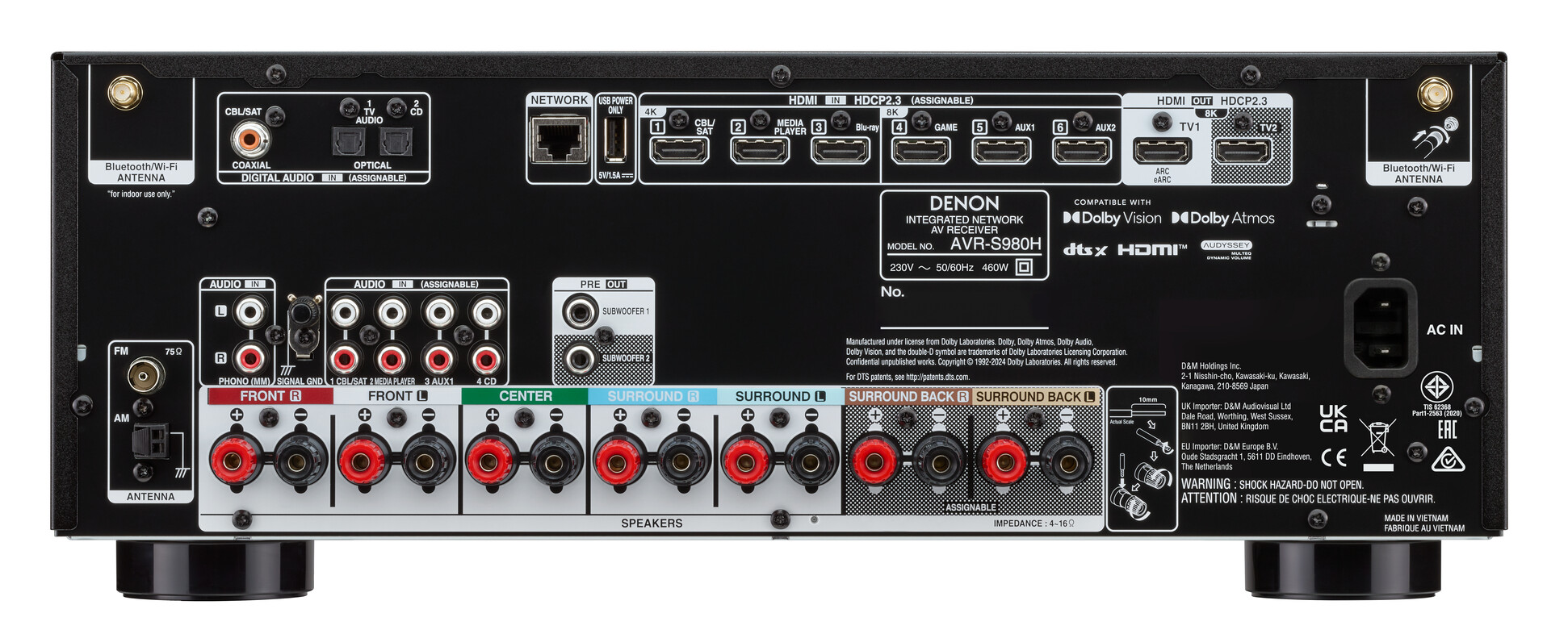 A Denon promete uma configuração fácil em apenas algumas etapas para o AVR-S980H, com o objetivo de trazer o som do cinema em casa para a sala de estar sem complicações. O receptor AV oferece 7.2 canais para essa finalidade; quando usado com Dolby Atmos, ele pode, por exemplo, ser operado em uma configuração de 5.2.2 canais com dois subwoofers e dois alto-falantes de teto. O amplificador fornece 90 watts por canal, o que deve representar potência suficiente para home cinema na sala de estar.