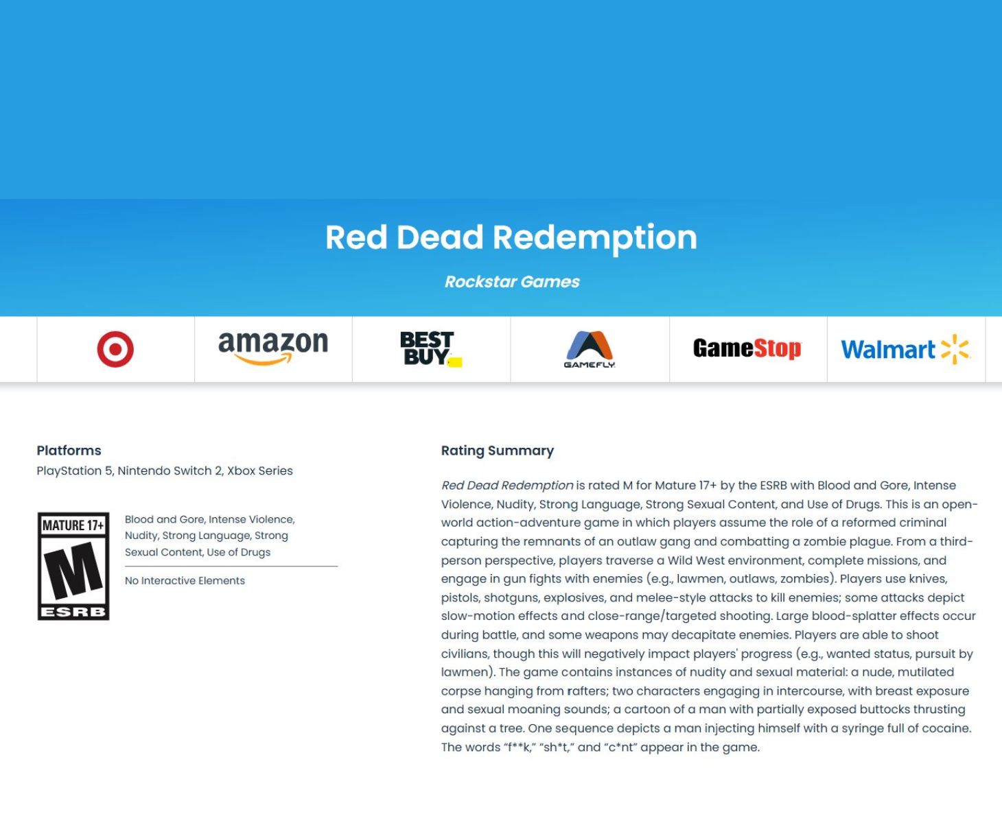A listagem inclui uma classificação "M for Mature 17+" com descritores como sangue e sangue, violência intensa, nudez, linguagem forte, conteúdo sexual forte e uso de drogas. O que se destaca é a seção de plataformas, que menciona explicitamente os sistemas PlayStation 5, Nintendo Switch 2 e Xbox Series. O ESRB menciona claramente os zumbis como inimigos no jogo, confirmando ainda mais que a classificação é para Red Dead Redemption 1 e sua campanha Undead Nightmare DLC .