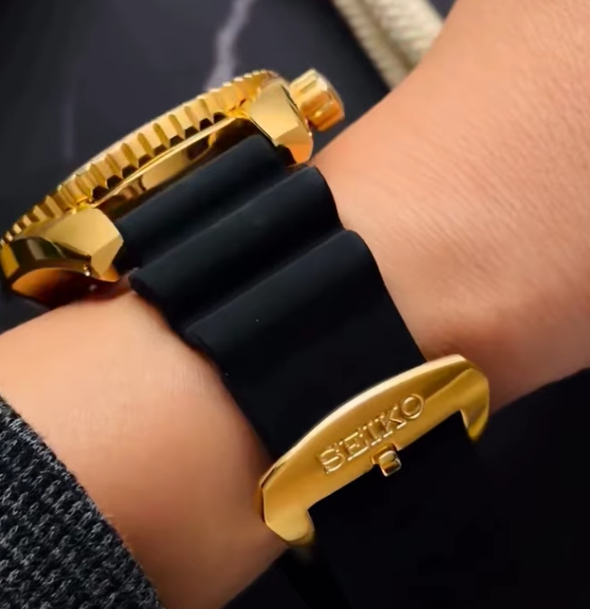 Um dos maiores pontos de discussão da revelação original foi a embalagem. A Seiko Tailândia envia o Muay Thai Limited Edition em uma caixa especial com o relógio em uma pulseira dourada, além de uma pulseira extra de borracha preta e uma fivela dourada combinando. O clipe prático se concentra nessa segunda opção. No pulso, a pulseira de borracha atenua um pouco o visual geral, fazendo com que o relógio pareça mais um mergulhador de uso diário com uma caixa chamativa em vez de uma joia de pulso completa. A pulseira afunila ligeiramente em direção à fivela de ouro assinada, que tem gravado o logotipo da Seiko.