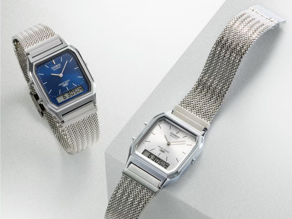 Esse lançamento inclui duas versões: o com mostrador azul-marinho AQ230EM-2A e o com mostrador prateado AQ230EM-7A. Ambas têm o familiar layout quadrado, com ponteiros analógicos na parte superior e uma leitura digital escondida no terço inferior. Essa configuração permaneceu quase intocada desde a década de 1990, mas a pulseira de malha dá a ela um toque mais polido.