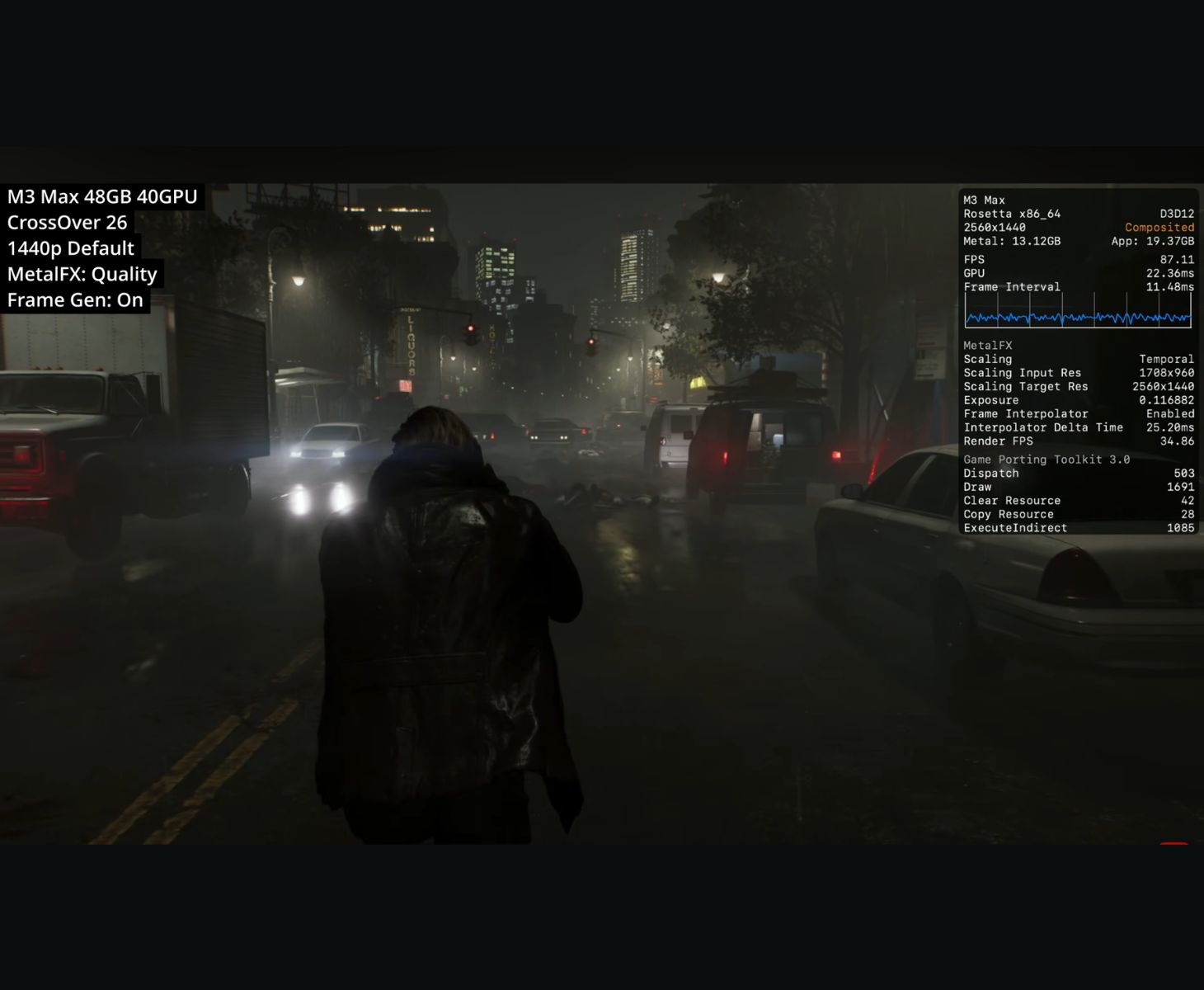 As máquinas mais novas se saem muito melhor. O jogo foi executado em um MacBook Pro M3 Max com 48 GB de memória unificada e uma GPU de 40 núcleos por meio do CrossOver 26. Em 1080p nativo com as configurações gráficas padrão, MetalFX desativado e geração de quadros desligada, o sistema manteve cerca de 70 FPS em uma cena de rua aberta, mostrando que o hardware pode lidar com o jogo confortavelmente sem depender de upscaling. A sobreposição também mostra o título sendo executado na camada Game Porting Toolkit do site Applecom tempos de quadro de aproximadamente 14 ms, enquanto usa cerca de 10,5 GB de memória da GPU.