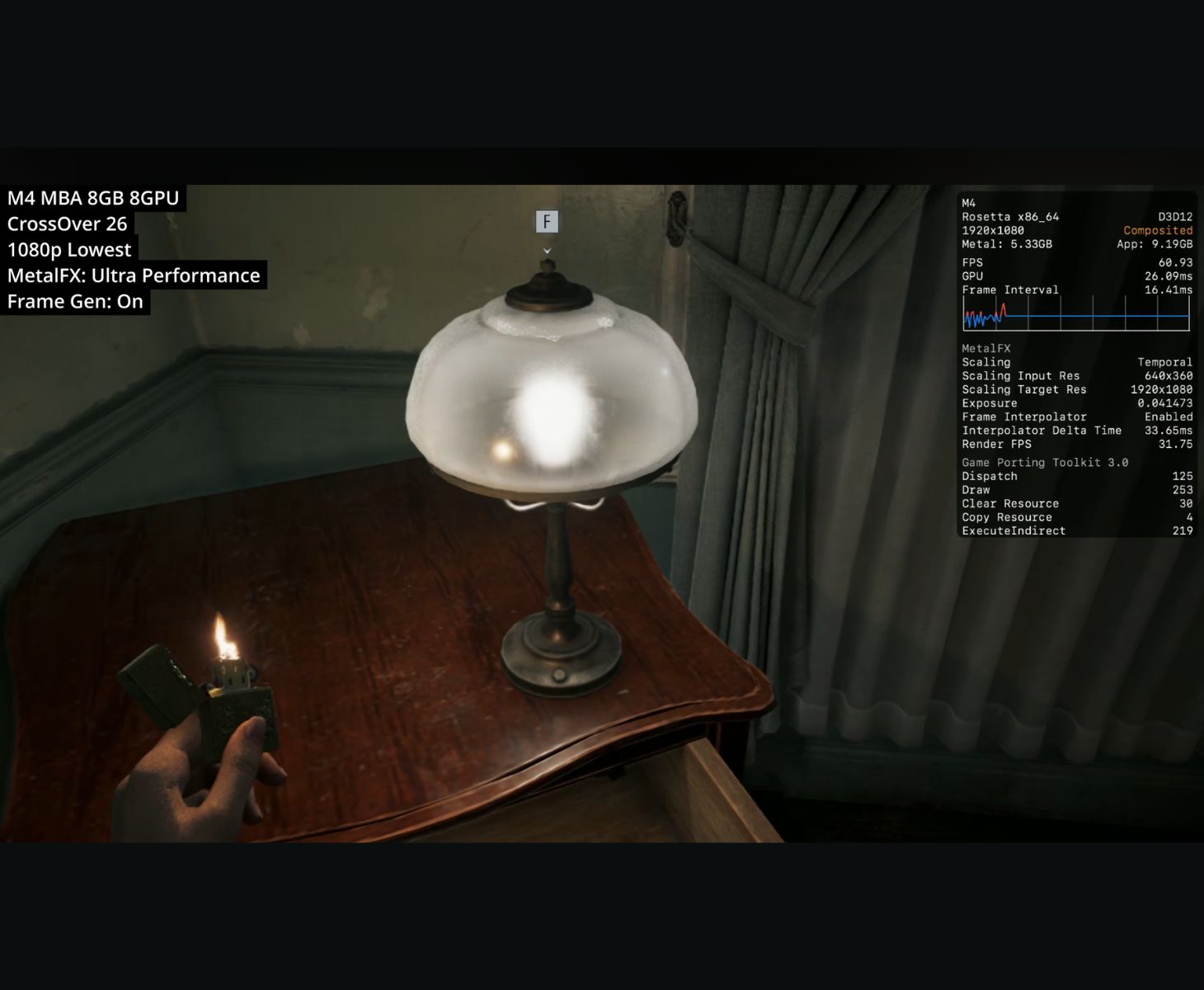 No mais econômico MacBook Air equipado com o chip M4o jogo ainda pode ser executado com alguns ajustes. O jogo foi configurado para 1080p com a predefinição gráfica mais baixa, enquanto o aumento de desempenho e a geração de quadros do MetalFX Ultra Performance foram ativados. Nessa configuração, o jogo atinge cerca de 60 FPS, com tempos de quadro próximos a 16 ms. A sobreposição também mostra um FPS de renderização de aproximadamente 31-32 FPS, indicando que a geração de quadros ajuda a aumentar a taxa de quadros final. O uso da memória da GPU fica em torno de 5,3 GB, enquanto a memória do aplicativo é de cerca de 9,1 GB.