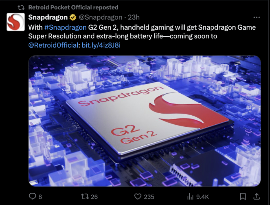 Por enquanto, a Retroid apenas sugere que apresentará algo futurista no final deste mês. Especificamente, a empresa confirmou que anunciará mais detalhes em 27 de outubro. Nesse meio tempo, a Qualcomm pode já ter dado a entender que o próximo dispositivo portátil para jogos da Retroid usará o Snapdragon G2 Gen 2, um chipset que estreou em março juntamente com outros dois chipsets voltados para jogos.